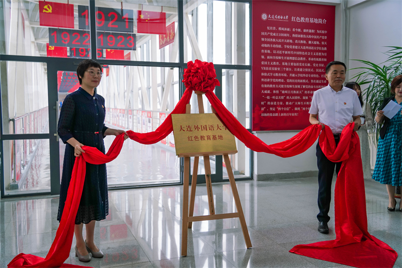 党委书记王伟辰与校长刘宏共同为大连外国语大学红色教育基地揭牌。