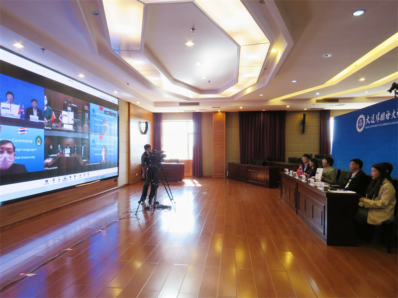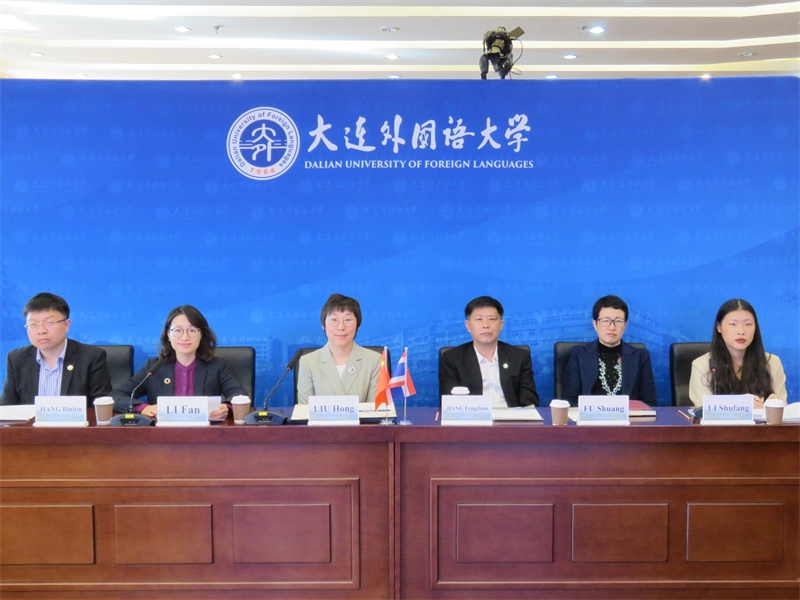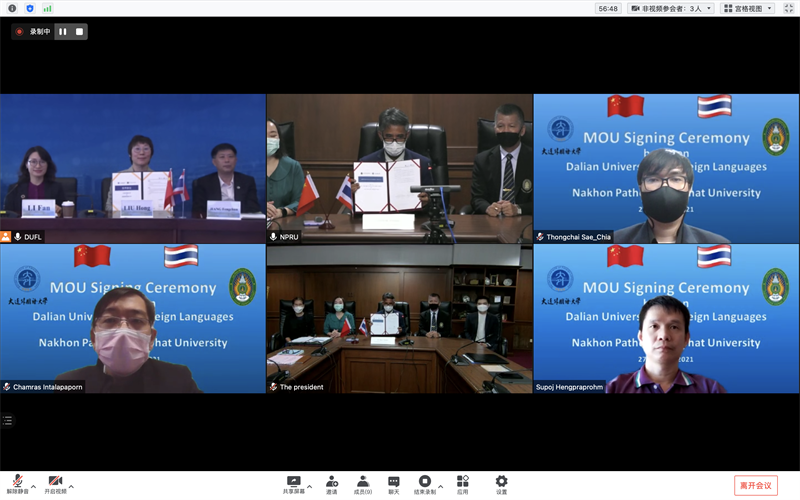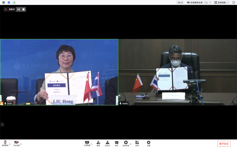 刘宏校长在致辞中表示,非常高兴能与佛统皇家大学开展线上交流并签署合作协议,她向威拉•宾高校长及其工作团队为促成两校合作所做的工作表示感谢。刘校长从建校历史、专业设置及国际化办学特色等方面详细介绍了我校情况。她表示,我校开设的专业中涵盖15种外语语种,为响应大连市泰语人才需求,2020年开设了泰语专业,受到了学生与家长的欢迎。我校国际化特色显著,已与海外230余所高校和机构建立了多领域多层次的交流与合作关系。疫情之前,每年接收来自70多个国家和地区的来华留学生1500余人次,泰语专业的开设进一步促进了中泰两国学生的交流。刘校长对两校合作充满期待,并诚挚邀请佛统皇家大学在疫情平稳后到访我校开展线下交流。
