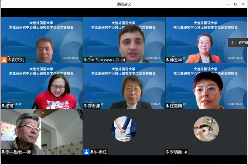 11月24日上午,我校东北亚研究中心俄语语言文学博士研究生高尔(Гор Саргсян)在亚美尼亚通过腾讯会议平台顺利完成博士学位论文答辩。他的博士学位论文题目为《中国公共外交文本特点研究—以中国中央俄文媒体为例》。答辩委员会主席由广东外语外贸大学博士生导师杨可教授担任,答辩委员由上海外国语大学博士生导师李勤教授,我校博士生导师彭文钊教授、任雪梅教授﹑傅玲教授担任。在答辩PPT汇报阶段,高尔以中国中央俄文媒体文本为语料,试图挖掘中国公共外交的整体特点,以及中国提高国家软实力、提升国家形象的话语建构途径。答辩委员会一致建议授予高尔博士学位。