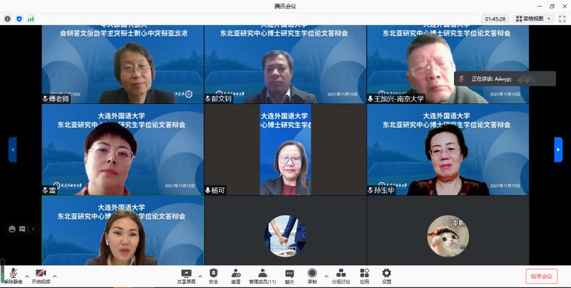 11月15日上午,我校东北亚研究中心俄语语言文学博士研究生阿依努尔(Байтелесова Айнур)在哈萨克斯坦通过腾讯会议平台顺利完成博士学位论文答辩,成为疫情防控期间我校首位全部以线上答辩方式申请博士学位的留学生博士。本次论文答辩委员会主席由广东外语外贸大学博士生导师杨可教授担任,答辩委员由南京大学博士生导师王加兴教授,我校博士生导师彭文钊教授、任雪梅教授﹑傅玲教授担任。答辩会上,阿依努尔就博士论文《政治语言学视域下哈萨克斯坦俄语媒体新闻标题中的“中国”观念(2014-2018年)》阐述了要点。答辩委员会一致建议授予阿依努尔博士学位,并推荐该论文为优秀博士论文。