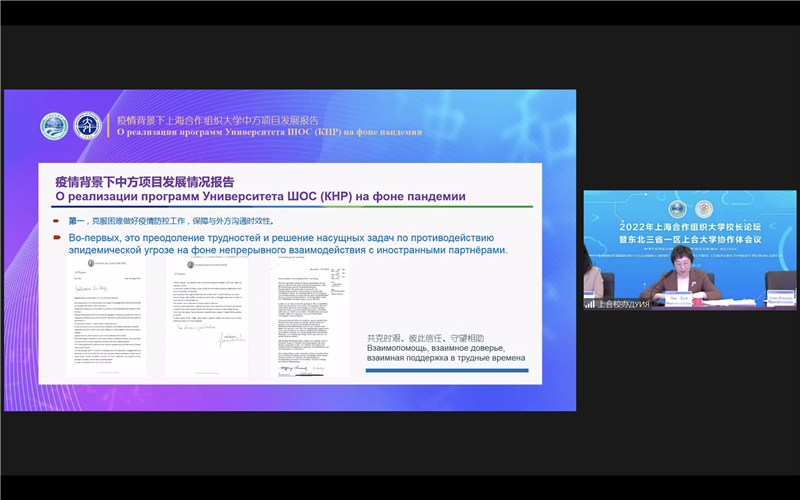 上合大学中方校长委员会主席、大连外国语大学校长刘宏教授做了题为“疫情背景下上海合作组织大学中方项目发展报告”的主旨发言。她对上合大学十年间的成就给予了高度的评价。成员国院校本着“互信、互利、平等、协商、尊重多样文明、谋求共同发展”的上海精神,在七个领域开展人才培养与科研合作,推动合作模式不断创新。上合大学成为国际教育交流与合作平台建设的典范,得到中外专家和师生的高度认可。展望未来,她提出五项举措以应对疫情背景下上合组织大学发展面临的挑战和构建更加紧密的上合组织教育合作体系。寄语各方,她提议上合大学今后应秉持和合共融的理念,站在为各成员国培养未来杰出人才的高度,共建上合组织大学命运共同体,共建东北三省一区上合大学协作体。