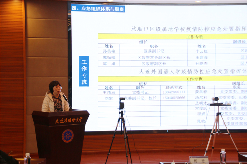 会议重点从7个环节和步骤对应急处理流程做了培训。一是封闭管理。安全保卫组第一时间启动校园封闭,按照网格化管理划分最小管理单元,60分钟内完成校门和全校各个区域封控。二是病例转运。防疫指导组第一时间确定病例位置,同时联系疾控中心将其引导至校内健康监测室隔离,等待120救护车将其转运。三是终末消杀。病例离开后,防疫指导组在区疾控中心指导下,对病例停留过的教室、图书馆、寝室、食堂、浴池等所有室内场所进行全面消杀。四是流调溯源。在区疾控中心指导下,对病例展开流调(14天学生行程日记),并在全校范围公布行程轨迹,24小时内形成流调报告。确认密接、次密接人员范围、名单、健康状况、行程轨迹等。五是转运隔离。转运组将排查出的密接和次密接人员第一时间护送到隔离楼进行隔离。在区疾控中心指导下,对需要集中隔离人员按照要求使用120负压车转运到校外集中隔离点。六是核酸检测。转运走病例和密接者后,学生返回宿舍,按照网格化管理划分的最小管控单元,由旅顺口区工作专班3小时内启动全员核酸检测。七是综合服务保障。封校、封楼后,物资保障组、心理健康专班开始工作。志愿者在封校封楼期间配合物资保障组运送物资和食物。