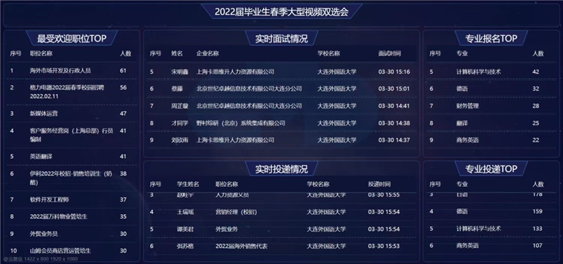 视频双选会期间,招生就业处使用“大外学生就业云平台”为来自19个省市地区17个行业的150家用人单位和2000余名2022届、2023届毕业生供提招聘对接服务,在线浏览量达34405次,毕业生共投递简历2075份,达成初步就业意向573人。邀请2021届5名毕业生参加“学长学姐助力春招、视频双选会冲刺专场分享会”,围绕“线上面试技巧”“考研失利后如何有效转战春招”“疫情常态化下求职心态调试”等话题展开讨论,为2022届毕业生积极、顺利就业加油鼓劲。邀请猎聘等5家企业招聘专家参与“企业助力,就业无畏”2022届就业困难群体指导活动,精准对接47名毕业生的“网申未果”“面试常挂”“职业规划不清晰”等就业疑惑和困难,有针对性地进行就业指导与帮扶。联合青岛人力资源管理协会举办大连外国语大学空中宣讲会—青岛专场,青岛啤酒等33家企业提供招聘岗位近3000个。