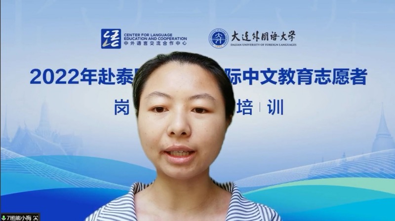 来自中国人民大学的熊小梅代表全体学员发言。她表达了对大连外国语大学的感谢,并表示全体学员将认真参加培训,努力学习知识,成为一个充满凝聚力的队伍。在赴任后精诚团结、互相帮助,为国际中文教育事业贡献绵薄之力,让更多海外友人能通过中文这把钥匙,接触到一个真实的中国,一个拥有灿烂文明的中国,一个以“和”为贵、包容开放的中国。