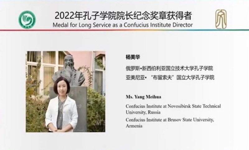 2009年至今,杨美华先后三次在我校俄罗斯新西伯利亚国立技术大学孔子学院和亚美尼亚“布留索夫”国立大学孔子学院担任中方院长。她在任的11年间,主动了解和发现机遇,实时推动孔院工作的开展。在新技大孔院任职期间,她与外方通力合作,着力培养本土教师,打造高端学术平台和特色品牌项目,促进了孔院内涵发展。2010年,新技大孔院荣获 “全球先进孔院”荣誉称号,2020年荣获全球“优秀汉语考试考点”称号。在“布留索夫”国立大学孔院任职期间,她注重汉语教学融入当地,推动孔院扎根本土,在当地两所著名大学开设汉语语言文化中心,组织编写教学大纲和本土教材,得到亚美尼亚教育部批准,成功推动汉语纳入亚美尼亚国民基础教育体系,开启亚美尼亚汉语教学专业化新局面。2016年,“布留索夫”国立大学孔院获得“全球先进孔子学院”称号;2018年,其本人荣获全球孔子学院“先进个人”称号。