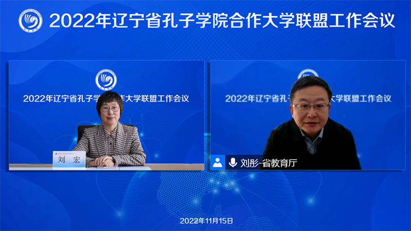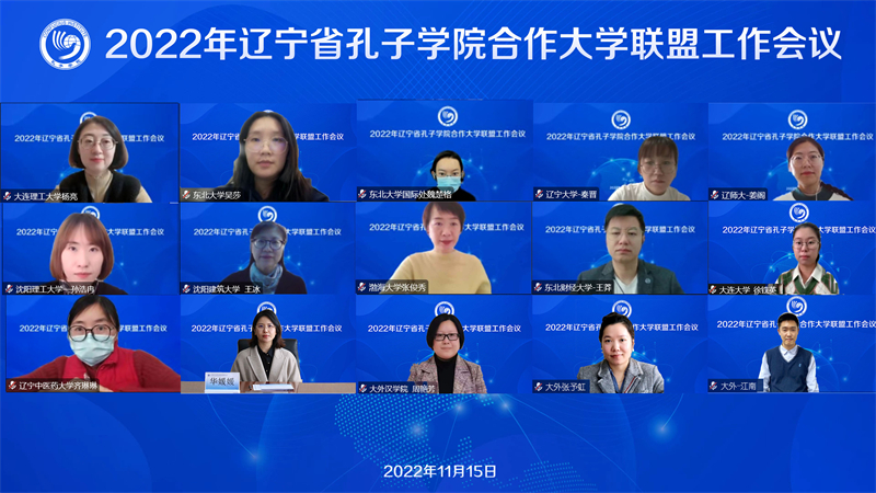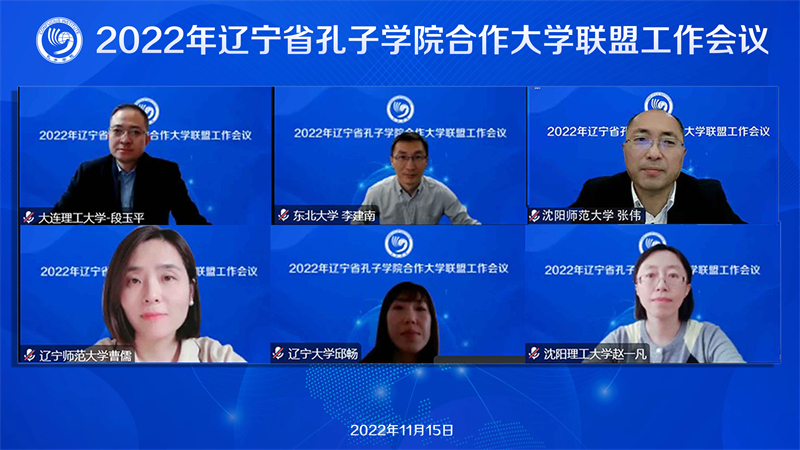 11月15日下午,辽宁省孔子学院合作大学联盟2022年工作会议在云端举行。辽宁省教育厅国际交流合作处处长刘彤,辽宁省孔子学院合作大学联盟理事长、我校校长刘宏,以及来自大连理工大学、东北大学、辽宁大学、辽宁师范大学、沈阳师范大学、沈阳理工大学、沈阳建筑大学、渤海大学、东北财经大学、大连大学、辽东学院、辽宁中医药大学、大连外国语大学等13所高校的26位代表参加了此次会议。