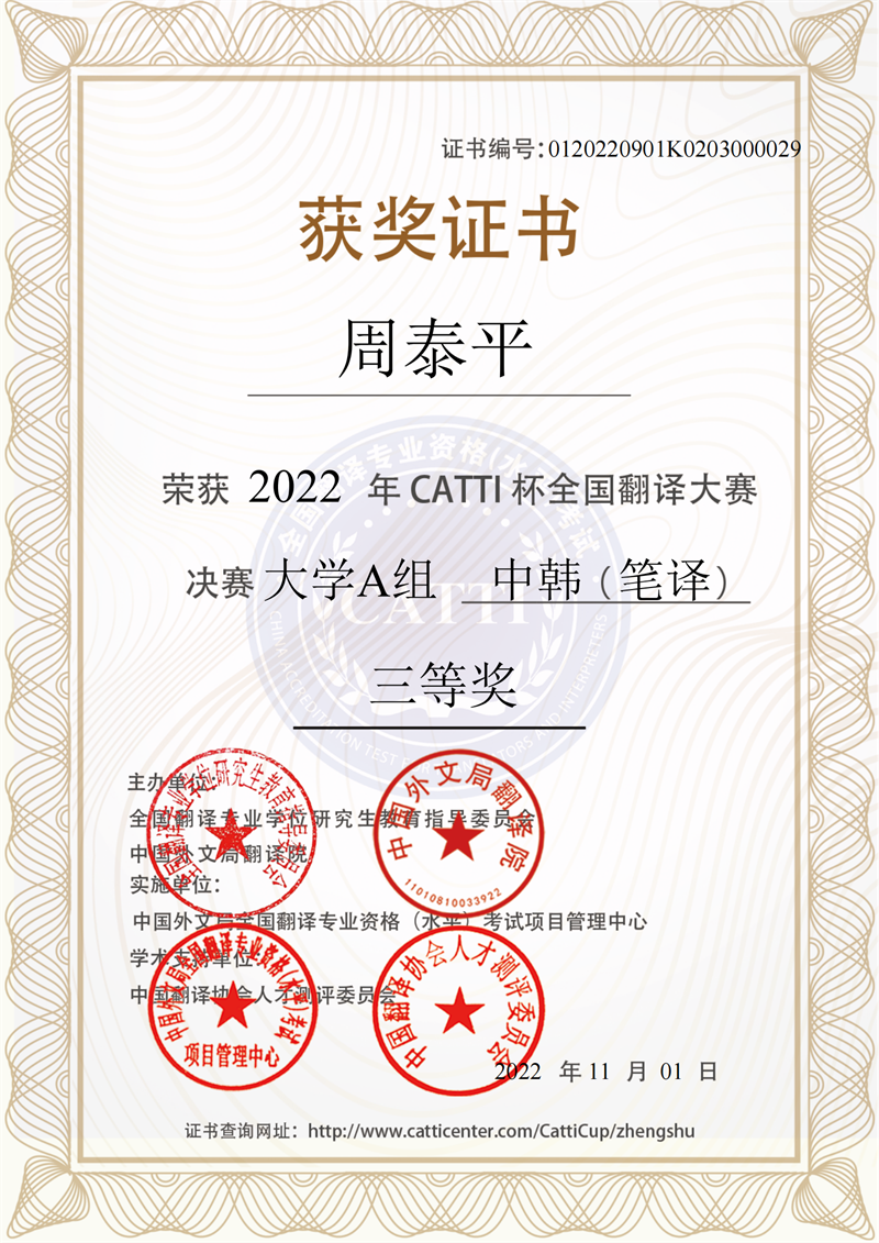 近日,由全国翻译专业学位研究生教育指导委员会和中国外文局翻译院主办、中国外文局CATTI项目管理中心负责实施的2022年“CATTI杯”全国翻译大赛各语种全国决赛获奖名单揭晓。历经初赛、复赛和决赛多轮比拼,我校韩国语学院2019级本科生周泰平荣获大学A组中韩笔译三等奖。