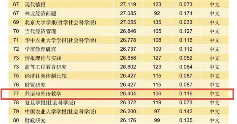 通过统计国际期刊对中国期刊的引用情况,《中国学术期刊国际引证年报》客观反映了我国学术期刊在国际学术研究领域的话语实情。自2012年首次发布以来,其已得到期刊界和科研管理部门的广泛认可,在助力中国期刊走向国际舞台、树立国际学术品牌和文化自信方面发挥了积极和重要的作用。学报《外语与外语教学》以较高的期刊影响因子数据,在国内数千家参评的人文社科类学术期刊中脱颖而出,彰显了多年来我编辑部坚持建设与发展特色学术话题栏目、注重加强我刊在国内外语言研究界影响力工作的喜人成就。(丁科家)