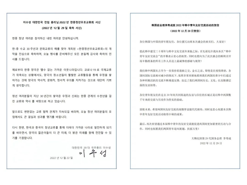 李寿成前总理在贺信中表示,韩中两国从古至今保持着敦睦之交、金石之谊。过去30年,两国青年以数千年来的友好交往为基础,共同构筑了友谊与信任的长城。希望今后两国青年开展更加紧密的互动与合作,推动两国友好关系特别是两国国民的高情厚谊代代相传。