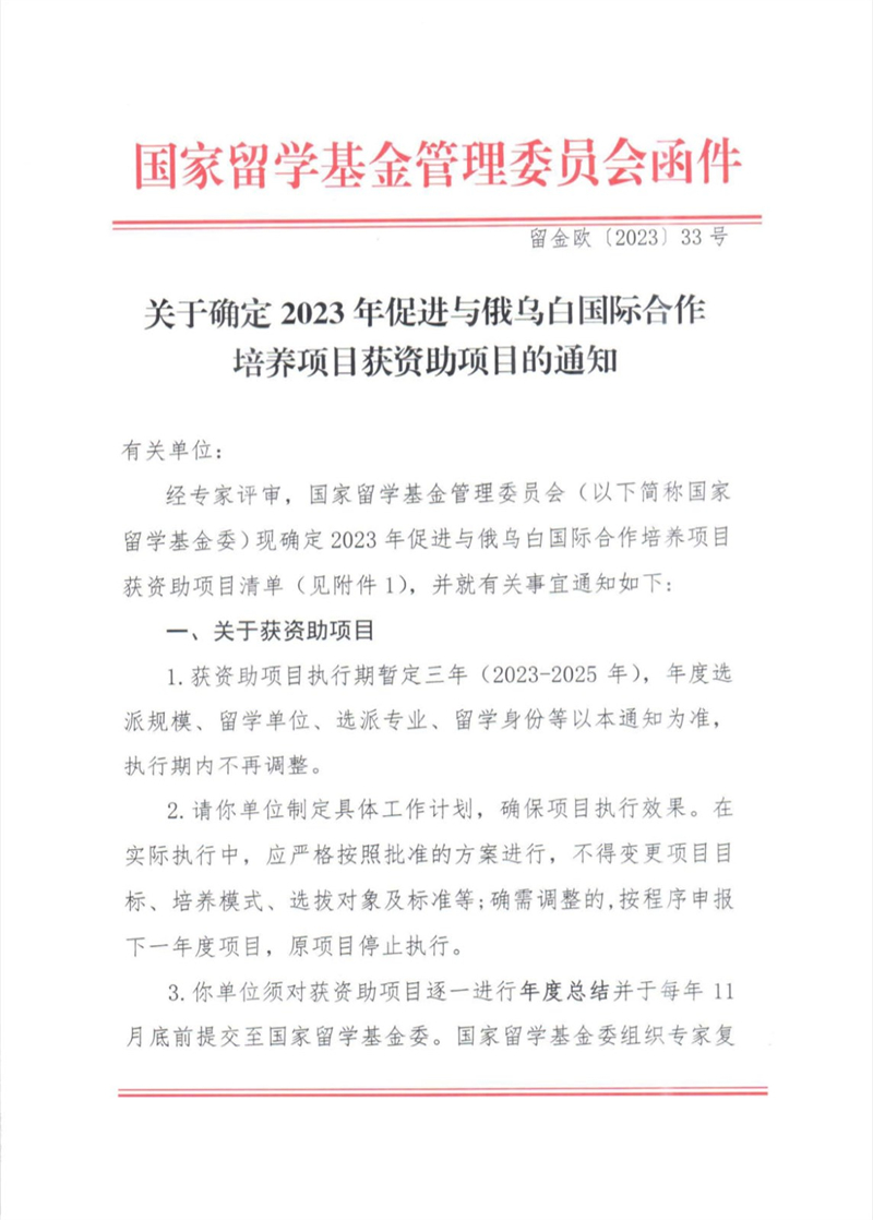 近日,国家留学基金管理委员会公布了《关于确定2023年促进与俄乌白国际合作培养项目获资助项目的通知》(留金欧〔2023〕33号),我校申报的《服务“一带一路”建设“俄语+区域学”本硕博人才培养项目》成功立项。该项目由国际交流与合作处牵头组织、俄语学院申报,依托与俄罗斯高校国际化人才培养合作渠道,紧密结合国家对外开放大局和高层次国际化人才培养需求,是我校区域国别研究及东北亚研究领域人才培养的又一重大突破。