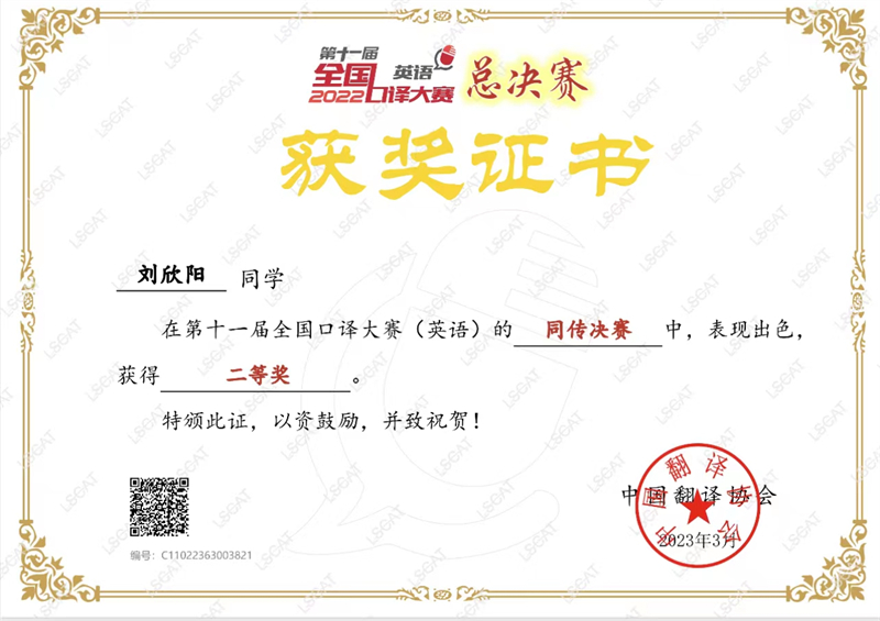 第十一届全国口译大赛共分为同声传译和交替传译两个单元。其中同声传译晋级赛单元选拔排名前10%的16名选手参加全国总决赛。刘欣阳和来自北京外国语大学、外交学院、美国明德学院蒙特雷国际研究院和纽卡斯尔大学等国内外名校的晋级选手同台竞技,凭借出色的表现获得专家评委的认可。最终以第12名的成绩斩获二等奖,也是我校在英语同声传译赛事中取得的最好成绩。