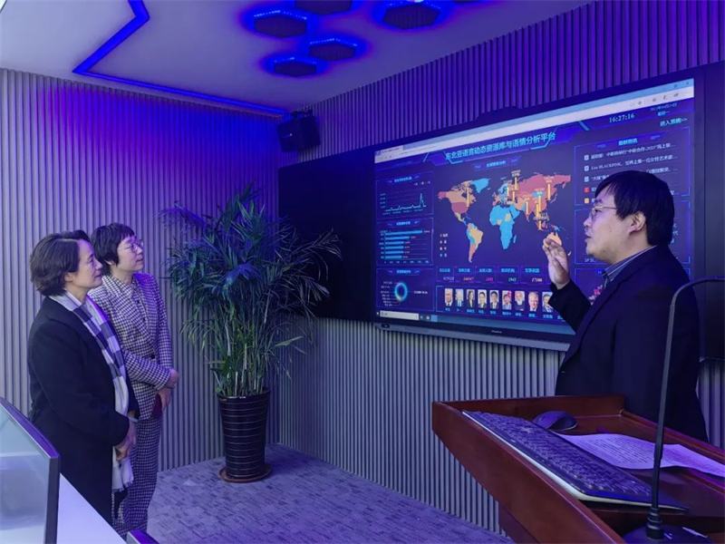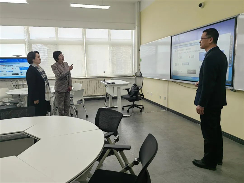 在英语学院,张秀丽一行实地考察了红色教育基地、智慧教室、“英语VR实训中心”和辽宁省高等学校哲学社会科学重点实验室“文科数字人文创新实验室”,现场听取了刘宏校长及相关部门负责人的介绍。我校始终把加强智慧教室和智慧实验室等智慧教学环境建设、实现教学场景升级,作为促进课堂教学改革、推进本科教学数字化转型的重要手段。自2020年起,建成并投入使用82间智慧教室、45间智慧实验室,在推动数字时代人才培养模式创新、教学方法改革以及教师智能素养提升等方面取得了显著成效。张秀丽对我校信息技术与外语教学深度融合的创新教学理念和先进的教学条件给予了高度评价,尤其对我校大数据平台建设、智慧教室和智慧实验室建设取得的成果成效给予充分肯定,鼓励学校进一步加强数字化平台建设,不断推进外语教育数字化发展。