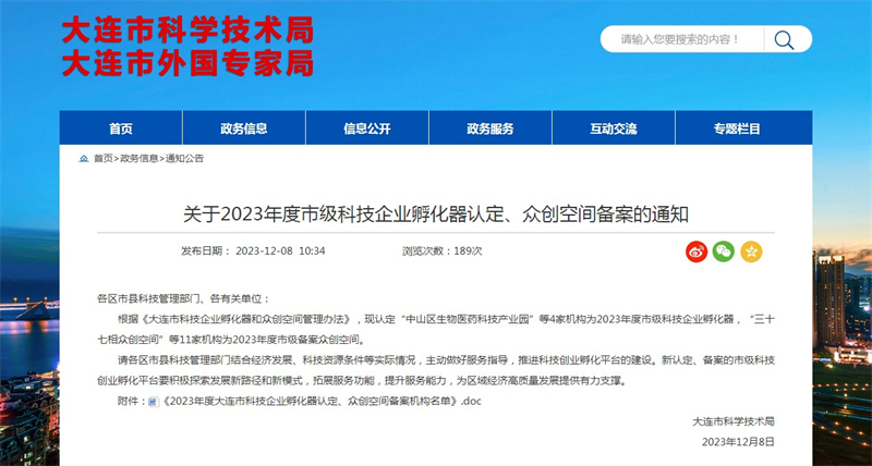 12月8日,大连市科学技术局公布了2023年度市级科技企业孵化器认定、众创空间备案名单,我校众创空间成功备案大连市“市级众创空间”。