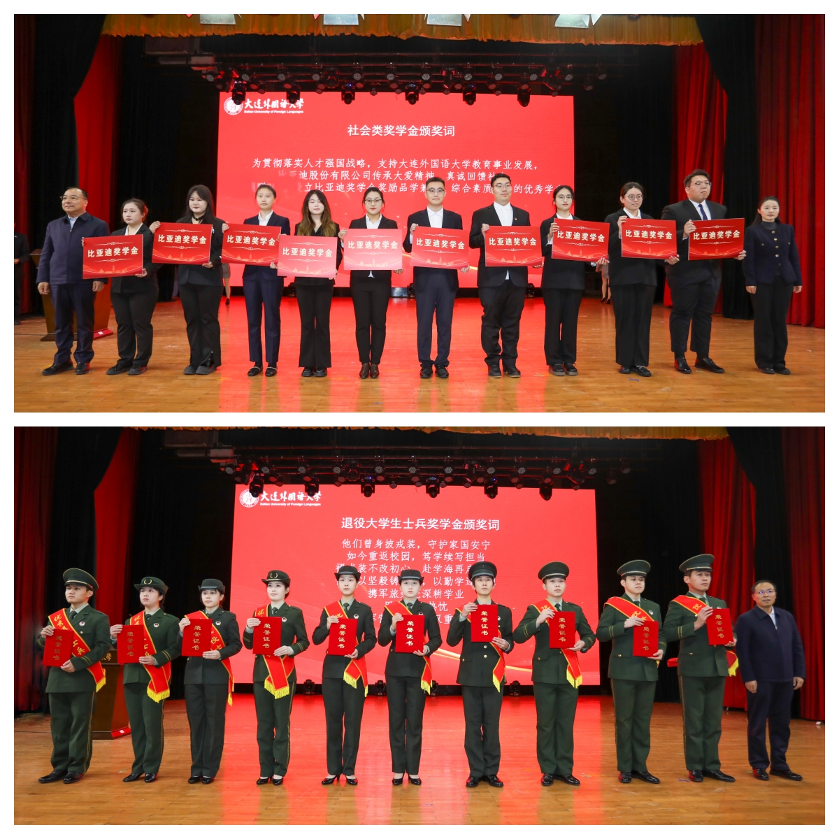 与会领导和嘉宾为诚信考试先进集体、学生公寓先进集体、先进分团委、先进学生会获奖集体、优秀班级、优良学风先进班级、先进团支部获奖集体、优秀学生干部、优秀团干部、优秀学生、优秀团员、优良学风先进个人、社会实践先进个人、优秀学生教官代表获奖学生、大学生标兵、优良学风标兵、自励自强标兵获奖学生、优秀退役士兵奖学金、省政府奖学金、国家奖学金、凯越奖学金、比亚迪奖学金获得者颁奖。