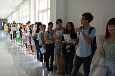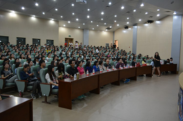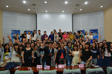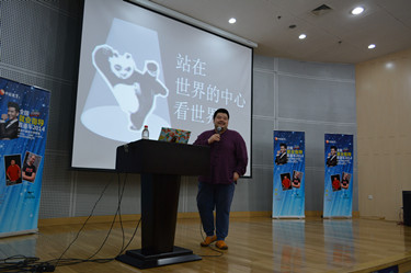 宣讲还未正式开始,报告厅内就坐满了观众,还有许多观众席地而坐。第一位宣讲嘉宾是新浪集团市场总监兼新浪微博人力资源总监、被青年朋友们誉为笑容可掬的职场知音申晨老师。他的演讲主题为站在世界中心看世界,他从宇宙大爆炸开始讲起,以八大行星,金字塔,麦田怪圈等为例教育我们要学会质疑和思考,告诉我们书上的内容不一定是正确的,但看书一定是正确的,而面试官最看重的恰恰是学习能力。申老师幽默诙谐,全场掌声不断。第二位宣讲嘉宾是已在北京生活20年的外国人江森海老师,他是“创可贴8”T-恤的设计者、老板,《职来职往》特约面试官。他为我们讲述了他来到中国并在南锣鼓巷安家,又成功创立了创可贴8的过程。他用他的亲身经历告诉我们作为创始人要有“想法”,并运用恒心与毅力努力实现它,配以适当的宣传才能够引众人的关注。随后,制片人张炀女士号召大家积极参加《职来职往》节目的招募。宣讲结束后,两位老师与各位领导及观众们合影,并为大外学子签名。