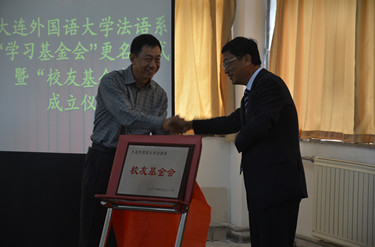 首先,副校长朱公巍与法语系78级校友,大连加华咨询有限公司总经理邴焕新先生共同为“法语系校友基金会”揭牌。随后,邴焕新总经理代表校友基金会发言,表达了对母校和法语系的感激之情,并表示今后要更广泛地发动和联系广大校友,为法语系的建设和发展献计献策,做出新的贡献。校友基金会秘书、法语系办公室副主任沙莎宣读了《法语系校友基金会章程》,并就基金会的收支状况进行了通报。