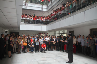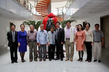 随后,俄语系72级校友刘利民发表了讲话。讲话中,他首先表达了重回母校的欣喜与种种感慨。看到大外的变迁,看到俄语系如今的建设成果,他满怀激动,同时又对我校及俄语系的发展前景充满信心。校训石镌刻着的“崇德尚文,兼收并蓄”激昂文字使他深有感触,这块校训石不仅仅是校友对母校、对俄语系拳拳眷恋与感恩之情的体现,更会成为激励师生的学海箴言。校训不仅会镌刻在玉石上,更会深深地镶嵌在俄语系师生拼搏进取的步伐里。讲话最后,刘利民副部长向曾经教过自己的退休老教师表达了深深的谢意和衷心的祝福,也向在校的师弟师妹们提出了殷切希望。在经久不息的热烈掌声中,刘利民副部长与孙玉华校长、彭文钊主任、校友代表及退休老教师代表共同为玉石揭牌。