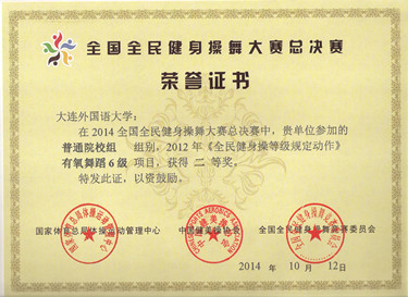 我校健美操队在体育教研部张丹王蓬两位老师的带领下,于10月7日至10月13日参加了在沈阳举办的“2014全国全民健身操舞大赛青岛总决赛”的比赛,一共有来全国20多个分站赛26个省市的254支队伍4300余人参加了此次盛会。我校健美操队全体队员不畏酷暑,经过一个多月的努力训练,在比赛中获得规定六级和时尚健身操舞两项二等奖,为我校争夺了荣誉。(张丹、王蓬)