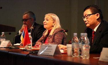 “中-亚合作”分场的参会人员主要有亚美尼亚外交官和俄罗斯、乌克兰、保加利亚等国的教育机构负责人员、媒体分析人士、科研工作者以及亚美尼亚师生代表。代表们从中-亚外交关系、中-亚高教合作前景、中国的亚美尼亚人、亚美尼亚经典作品中的中国形象、中国经典作品的多角度解读、中国古代哲学思想对当今社会的影响、中国神话中的宇宙思想、中国人的民族性格等方面进行了深入而饶有兴趣的研讨。代表们对中国文化表现出了强烈的兴趣,一致看好中-亚两国的合作前景。