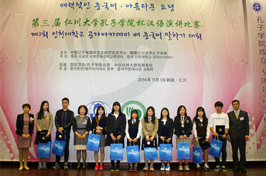 为庆祝我校仁川大学孔子学院成立5周年暨全球孔子学院成立10周年,11月1日,“魅力汉语•美丽辽宁/第三届仁川大学孔子学院杯韩国高中生汉语演讲大赛”在仁川大学孔子学院礼堂隆重举行。本次大赛由我校仁川大学孔子学院和中国辽宁省国际文化经济交流中心共同主办,并得到孔子学院总部/国家汉办和中国驻韩大使馆教育处大力支持。我校校长孙玉华,仁川大学校长崔省乙,辽宁省国际文化经济交流中心秘书长邵迦,仁川国际交流财团代表理事尹勉相等各界人士出席了本次活动。