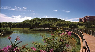 湖桥形状曲线柔美,形似新月之“弦”。新月,指上弦月,象征上升、新生、新的时光;湖桥名分别为“明阳”与“新月”,阳刚之美与婉约之秀相辅相成;新月谐音“新跃”,意指我校更名为大连外国语大学后,正在开启新征程、实现新跳跃,完成新的历史跨越之意。