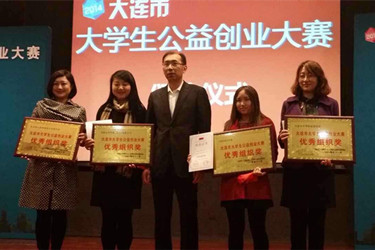 11月24日,由共青团大连市委员会主办,大连市青少年发展基金会、大连市青年公益事业发展促进会及我校承办的大连市大学生公益创业大赛总决赛暨颁奖典礼隆重举行。大连市委统战部副部长黄刚、大连市团市委副书记孙晓峰、大连市青少年发展基金会理事长赵强、大连市团市委学校部部长王琳琳、我校团委书记张皎、大连市中华职业教育社秘书长王晓辉、大连市青年公益事业发展促进会理事长张勇出席大赛。经过大赛评审委员会评议结合现场观众投票,大赛的各个奖项逐个揭晓,来自东北财经大学的“公益履行者之家”项目最终拔得头筹,大连海事大学“健康文化传播计划”获得二等奖,大连外国语大学、东北财经大学“大连市水资源环保协会”项目荣获第三。大连外国语大学“心目图书馆”获得大赛优秀奖,我校团委获得最佳组织奖。