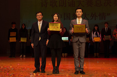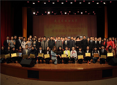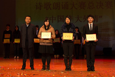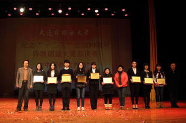 12月9日下午2点,由共青团大连外国语大学委员会主办的纪念12•9运动79周年“中国梦,大外情”诗歌朗诵大赛决赛在我校启航楼礼堂隆重举行。校党委书记刘玺明、副校长朱公巍、校长助理徐浩特与各院系党总支书记、副书记、分团委书记、辅导员老师等与在场千余名学生共同欣赏了大赛。出任本次比赛的评委有旅顺口区广播电视台副台长魏宏亮、旅顺口团区委书记李斌、团市委大连《青春行》杂志执行主编陈迪、大连海事大学法学院党委副书记李佳、我校党委组织部部长王伟辰、工会主席于东洋、科研处长任晓丽、学生工作处处长赵勇、团委书记张皎。