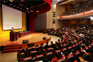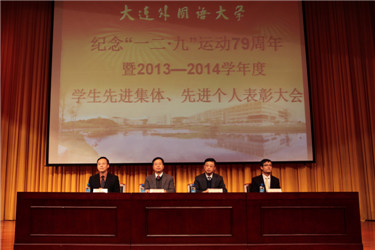 最后,校党委书记刘玺明发表讲话。他首先对获奖集体和个人表示祝贺,向为学生的健康成长而辛勤工作的全校教职员工表示亲切的慰问和衷心的感谢。刘书记在追忆了“一二•九”运动及其深远的历史意义之后,向同学们提出了三点希望和要求。第一,弘扬“一二•九”精神,激励民族壮志,高扬爱国旗帜。要主动关心国家大事,不断提高思想政治素质,要将国家的宏观战略和个人的前途事业紧密结合起来,把个人梦想融入全民族的共同梦想之中,以执著的信念、优良的品德、丰富的知识、过硬的本领,勇敢地担负起历史重任,努力成为中国特色社会主义事业的建设者和接班人。第二,弘扬“一二•九”精神,传承民族文化,促进中外交流。要情系大外、发挥优势,自觉将全面发展和个性发展紧密结合,将文化知识学习和思想品德修养紧密结合,自觉将创新思维和社会实践紧密结合,成为坚守理想的有志青年、勇于创新的有才青年、品德高尚的有德青年、开拓进取的有为青年。要勤奋学习,潜心钻研,做人类文明进步的推动者;要研读中华宝典,兼收并蓄,融汇中西,做中华文化的传播者。第三,弘扬“一二•九”精神,永葆赤子之心,争做栋梁之材。要博学笃志、切问近思,勤于学习、敏于求知,主动适应知识更新不断加快的趋势,把学习内化为人生态度、生活方式和毕生追求,不断拓宽学习领域,完善知识结构,学习新知识,掌握新技能。作为青年学子,要敢思、敢想、敢为人先,始终保持蓬勃向上的朝气、开拓进取的锐气、不畏艰险的勇气,把深入实践作为成长成才的必由之路。讲话最后,刘书记鼓励全校同学在新的一年里继续秉承“崇德尚文、兼收并蓄”的校训精神,自觉担负起时代赋予的光荣使命,以坚定远大的理想励志前行,以孜孜不倦的精神求索新知,以高尚美好的情操培育品德,以锐意创新的激情投身实践,为实现“中国梦”、“大外梦”和“我的梦”而不断谱写新的篇章!(李殿峰)
