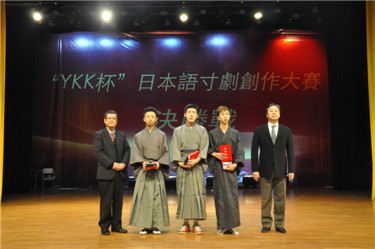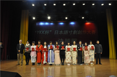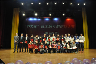 12月15日下午,由我校日本语学院主办,大连吉田拉链(YKK)有限公司赞助的“YKK杯”日剧创作表演大赛决赛在我校启航楼举行,大连吉田拉链(YKK)有限公司总经理長崎栄人,大连吉田建材有限公司总经理宮原弘樹,我校教务处处长宫伟,日本语学院党总支书记徐国飞,院长刘利国,党总支副书记于克振、副院长于飞出席了本次比赛。日本语学院多名教师,日籍外教担任比赛评委。