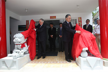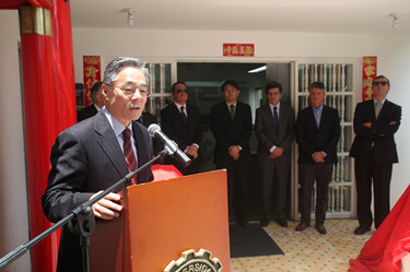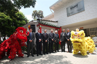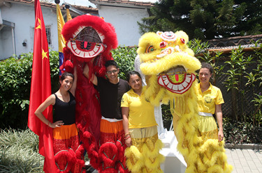 3月24日上午11时,我校麦德林孔子学院南校区举办狮子雕塑坐落揭幕仪式,揭开了我校麦德林孔子学院建立五周年暨春节庆祝活动的序幕。中国驻哥伦比亚大使汪晓源、麦德林市副市长费利佩•霍约斯(Felipe Hoyos)、伊菲特大学校长胡安•路易斯•梅西亚•阿朗戈(Juan Luis Mejía Arango)、中国驻哥伦比亚大使馆文化参赞赵晓鸣、前哥伦比亚驻华大使卡洛斯•乌雷亚(Carlos Urrea)、伊菲特大学语言中心主任托马斯•汉斯• 特洛伊特勒 (Thomas Hanns Treutler)、麦德林孔子学院外方院长巴勃罗•埃查瓦利亚•多罗(Pablo Echavarría Toros)、中方院长高正月、狮子雕塑设计和制作者胡安•迭戈•拉莫斯(Juan Diego Ramos)、孔子学院中外方教职员工、学生及各界友好人士100余人出席。安蒂奥基亚省省长塞尔吉奥•法哈多(Sergio Fajardo)还专门致函表示祝贺。汪晓源大使和巴勃罗(Pablo)院长共同为狮子雕塑揭幕。