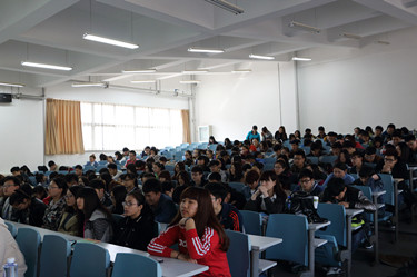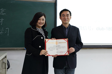 赵放老师以一个智慧长者的身份与在座同学进行了交流。赵老师首先告诉大家如何在当众讲话时放松自己,首先要深呼吸,有良好的心理暗示以及善意的眼神接触。接着,赵老师请一些同学上台进行3分种即兴演讲,同学们跃跃欲试,纷纷响应。随后,赵老师讲解了当众讲话时需要注意的原则——逻辑性。当众讲话结构要有层次,说话要连贯,语言要周密。他分别引用二月河的守时、守信、守事和“黄金三点论”使同学们更加深刻地意识到讲话中逻辑的重要性。在此基础上,赵放老师娓娓道出当众讲话时的需要注意的结构。讲话时需要有导入,接着正文,然后收尾,最后回顾。对于同学们稍显不足的讲话结构,赵老师则在一旁耐心提点,最后完成了精彩的即兴演讲,同学们纷纷抱以热烈的掌声。接下来,赵老师让在座同学做成语接龙,由此引出当众讲话的第二个原则——生动性。他展示了许多有文采的对联,并与大家互动交流,一句“天理国法人情”让同学们思考良多。随后,赵老师让同学们谈谈对人才的认识。经过了之前的学习和训练,同学们的表达能力增进了许多。最后,赵老师总结出 “德才兼备方为人才”结束了本次精彩的讲座,我校团委书记张皎为赵放老师颁发了励志讲坛证书。
