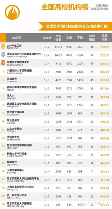 5月20日,清华大学新闻与传播学院新媒体研究团队(@新媒沈阳)在国内发布了《全国高校•教育新媒体风云榜》,该榜单筛选全国高校和教育行业最重要的微信公众号5903个,通过微信公众号推送文章的传播度、覆盖度及公号的成熟度和影响力,来反映微信整体热度和公众号的发展走势。在5月19日发布的排行榜中,我校学生工作处官方微信平台“大外学生工作”在全国高校校级机构官方微信排行榜中位列第一名。