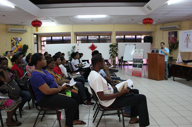 当地时间4月22日下午两点,我校圭亚那大学孔子学院邀请中国第十一期援圭医疗队中医医生贾磊为圭亚那大学师生带来一场以“传播中国传统文化,弘扬中医药精髓”为主题的中医体验式讲座。医疗队队长王永祥率领11位队员莅临讲座现场,来自圭大医学院以及社会各界对中医感兴趣的人士纷纷到场聆听。