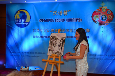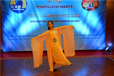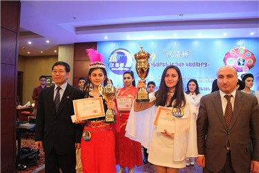 首先进行的是第十五届“汉语桥”世界大学生中文比赛选拔赛,之后又进行了第九届“汉语桥”世界中学生中文比赛亚美尼亚地区选拔赛。两场比赛都包括中国文化知识笔试、中文演讲、即兴问答和才艺展示四个部分。选手们分别以《梦想点亮为来》和《我与孔子学院》为题,满怀激情地抒发了自己对中国文化的热爱和对中国的向往,以及对孔子学院的感激之情,并大量引用“学而不思则惘,思而不学则殆”、“知之者不如好之者,好之者不如乐之者”、“海内存知己,天涯若比邻”等经典名句表达了自己学好汉语,献身中、亚两国友好事业的决心和信心。选手们标准流利的汉语发音赢得了在场观众的阵阵掌声。两场比赛的选手们不仅精彩地演绎了《今生缘》、《隐形的翅膀》、《在那遥远的地方》、《又见炊烟》等中文歌曲和《临水》、《兰陵王入阵曲》、《惊鸿舞》、傣族孔雀舞等舞蹈,还为大家带来了数来宝、诗词朗诵、葫芦丝、武术、国画、沙画等语言文化节目,充分展示了亚美尼亚人多才多艺及富有创造力的特点。经过紧张激烈的角逐,大学生组的比赛决出了一等奖、二等奖、最佳口才奖、最佳才艺奖和优胜奖,中学生组决出了一等奖、二等奖和优胜奖。田二龙大使和各位嘉宾为获奖选手颁发了获奖证书和奖品。