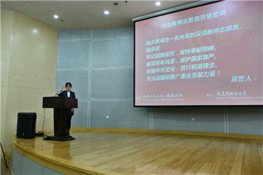 来自北京大学的学生蒋一笑代表全体志愿者学员发言。她表示,对外汉语教育工作与国家、时代的发展规律紧密相连,每一位志愿者都会把它当作自己的一份事业去认真对待。作为汉语国际推广的重要力量,作为对外汉语教师志愿者,大家将践行志愿者的奉献精神、团队精神与专业精神,以深切的感情、满腔的热情和高涨的激情,承载高度的责任感、使命感与荣誉感,去完成汉语国际推广的使命,努力成为一名优秀的志愿者。