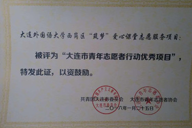 为进一步推动大连市青年志愿者行动的开展,共青团大连市委员会、大连市青年志愿者协会共同举办了第七届大连市十杰百优青年志愿者评选活动,表彰在全市各个青年志愿服务领域表现突出的优秀组织及先进个人,我校国际商务学院志愿服务团队在此次评选中收获颇丰,斩获两项荣誉称号。国际商务学院“筑梦”爱心课堂志愿服务项目被授予“大连市青年志愿者行动优秀项目”称号,国际商务学院学生郝珍奇获“大连市优秀青年志愿者”称号。