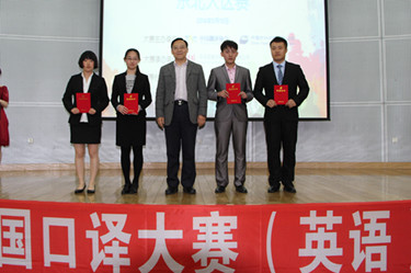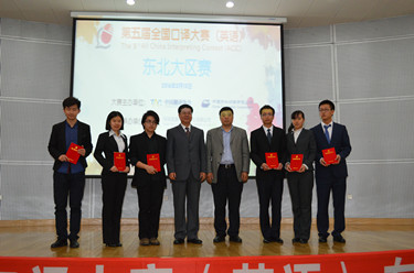 近日,第五届全国口译大赛(英语)东北大区赛在我校图书馆报告厅举行。担任本次大区赛的评委来自辽宁、吉林和黑龙江三省的外事部门和高校。我校副校长杨俊峰教授担任主任评委,大连市外办正局级巡视员张建威先生、黑龙江大学严明教授、东北师范大学高瑛教授、东北大学邓建华教授担任评委。我校校长刘宏教授莅临现场观看比赛,并为获得一等奖的选手颁奖。